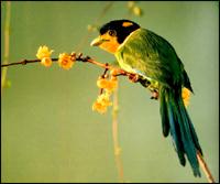 大型雀类。全长26厘米左右。上体草绿色。头黑色,头顶中央有翠蓝色块斑;后枕两侧各有一鲜黄斑;前额基线至眼先、喉部及颈侧*;嘴型宽扁,蓝绿色。飞羽黑褐色,有翠蓝色翼斑。尾以翠蓝为主。下体淡绿色。脚橄榄绿色。