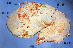 唾液的PH值为8.1,呈碱性,可中和瘤胃内微生物发酵产生的有机酸,维持胃内一定PH值。一昼夜约分泌唾液50-60升。 牛的瘤胃不分泌消化液,但对已经分解之营养物质有很强的吸收作用。采食后咽下去的食物呈团状,每 个食团约100克左右,其中稍重点的食团不经瘤胃直接进入网胃,一般的食团则先经瘤胃再入网胃。网胃将两方面来的食团,经过