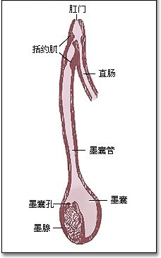乌贼的墨囊是一个发达的直肠盲囊,在胚胎时期,由中肠的一部分向外突出而成。墨囊可分为腺体部(墨腺)、囊状部(墨囊)及管状部(墨囊管)三部分。墨腺能分泌黑色的墨汁,具有毒素,分泌出的墨汁从墨腺孔流出。贮藏在墨囊中,墨囊管是一根将墨汁输出到体外的管道,开口在直肠的最末端,位于肛门附近。