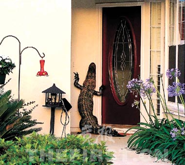 美国南卡罗莱那州希尔顿·海德岛太阳城的洛利塔夫妇在家中共进晚餐时,突然听到外面有人砰砰地敲门,洛利塔太太站起身准备去开门时,还和家人开玩笑说:“猜猜谁来吃晚餐?”结果当洛利塔太太从门洞窥视孔中往外看时,不由吓得魂飞魄散,原来敲门的访客不是人,而是一条两米长的大鳄鱼! 据报道,罗伯特·洛利塔和妻子罗斯琳·洛利塔居住在美国南卡罗莱那州希尔顿·海德岛度假胜地太阳城。