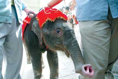 大象馆的大门口张灯结彩,桌上摆放着蛋糕和香槟酒,小朋友们手举着彩色的气球等候着,大象悠闲地在馆外散步。这是北京动物园给2004年7月16日降生的象宝宝过满月。