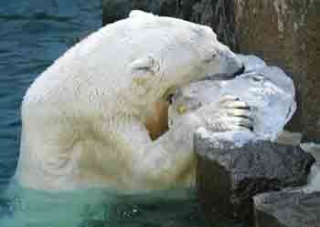 2002年8月10日,在日本东京的一家动物园里,一只北极熊在水中吃冰块纳凉。