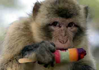2002年8月20日,一只地中海猕猴在德国诺伊明斯特动物园啃冰棍消暑。
