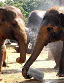 2001年8月15日,两头象在伦敦动物园里享受一块冰棒糖。