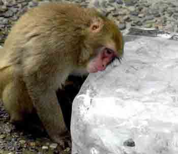 2000年8月2日,在日本东京上野动物园内,一只猴子将脸颊贴在冰块上消暑。