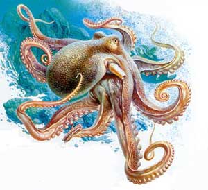 这种章鱼身长约60厘米,全身呈棕色,触角很长。当遇到危险时,它们可以通过改变身体的形状和颜色,模仿许多海洋有毒动物的外形,使自己的天敌不敢轻举妄动,以脱离危险。