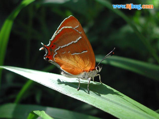 4昆虫种名:线灰蝶 Thecla betulae Linnaeus 4所属类别:鳞翅目 灰蝶科 4拍摄时间:2002.07.14 拍摄地点:东灵山 4简要介绍:体翅黑褐色;后翅有1宽尾状突,橙红色,尖端白色。 4虫体大小:翅展38--40mm 4区域分布:北京