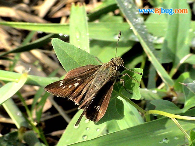 4简要介绍:翅面黑褐色,前翅8个半透明白斑排列成半环状。雄性在中室下方有1线条性标,雌性在中室下方有2个斑。