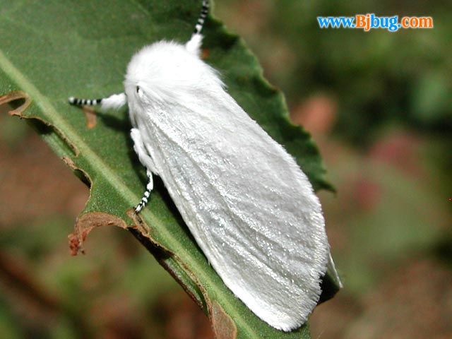 4昆虫种名:美国白蛾 Hyphantria cunea (Drury) 4所属类别:鳞翅目 灯蛾科 4拍摄时间:2002.06.10 拍摄地点:朝阳区 4简要介绍:纯白色,体中型。头白色,复眼黑褐色,下唇须小,下端黑褐色。 4虫体大小:翅展23--34mm 4区域分布: