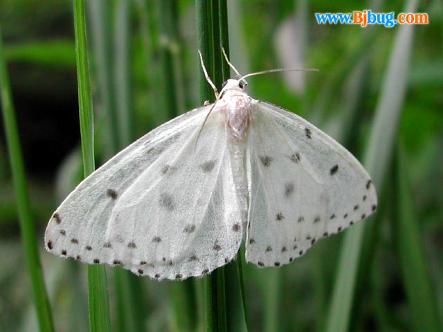 4昆虫种名:未知种类 4所属类别:鳞翅目 尺蛾科 4拍摄时间:2002.07.13 拍摄地点:东灵山 4简要介绍:粉白色,微灰,翅上有黑灰色脉点。 4虫体大小:翅展37--40mm 4区域分布: