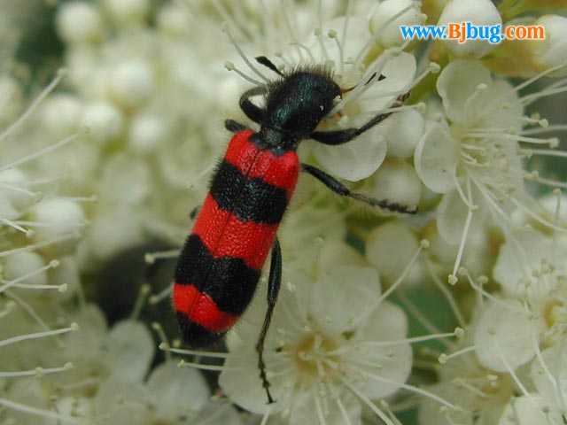 4昆虫种名:Trichodes sp. 4所属类别:鞘翅目 郭公虫科 食蜂郭公虫属 4拍摄时间:2001.08.04 拍摄地点:门头沟 4简要介绍:鞘翅红色,胸部和鞘翅斑纹由亮蓝色到深色不等。 常见于花朵之上,咬食花粉,但主要捕食访花昆虫。 4虫体大小:体长13mm 4区域分布:北京;南欧和中欧