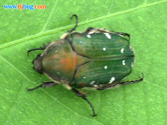 4简要介绍:体暗绿色,有大小不等的白色绒斑;鞘翅上的银白色绒斑:近缝肋和外缘各有3个,侧缘3个较大; 臀板外露,有4个横列的银白色绒斑。