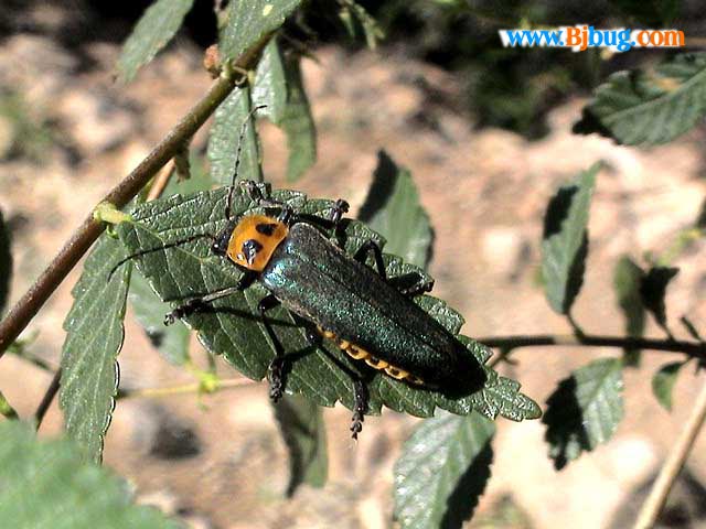 4昆虫种名:未知种类 4所属类别:鞘翅目 花萤科 4拍摄时间:2002.05.24 拍摄地点:松山 4简要介绍:鞘翅蓝绿色,前胸背板方形,*。 4虫体大小:体长19mm 宽7mm 4区域分布:北京