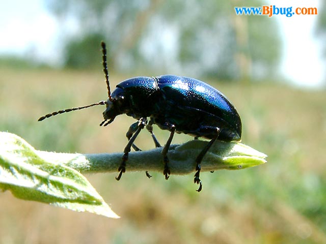4昆虫种名:杨蓝叶甲 Agelasfica alni 4所属类别:鞘翅目 叶甲科 4拍摄时间:2002.06 拍摄地点:朝阳区 4简要介绍:椭圆形,蓝黑色具紫色光泽。鞘翅蓝色。密生成行刻点。 为害榆树、杨树、柳树、苹果。 4虫体大小:体长7.0--7.5mm 4区域分布:北京、新疆等