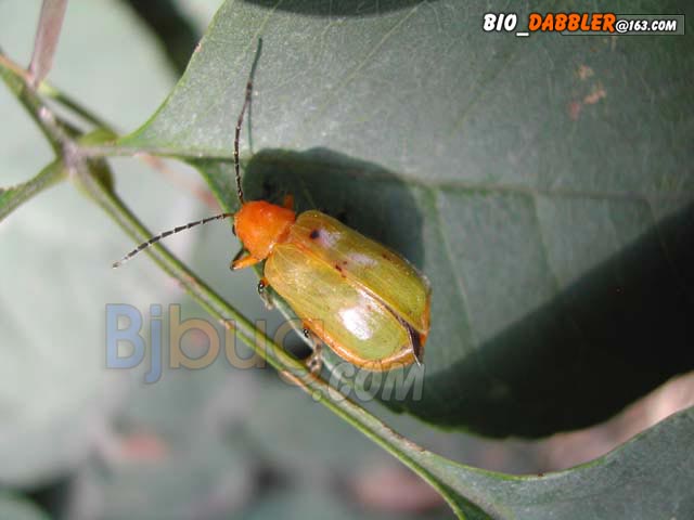 4昆虫种名:未知种类 4所属类别:鞘翅目 叶甲科 4拍摄时间:2002.09.22 拍摄地点:金山 4简要介绍: 4虫体大小:体长10--11mm 4区域分布: