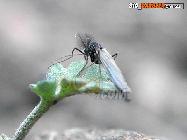 4昆虫种名:未知种类 4所属类别:双翅目 摇蚊科 4拍摄时间:2003.03.22 拍摄地点:门头沟 4简要介绍: 4虫体大小:体长8mm,翅展12mm 4区域分布: