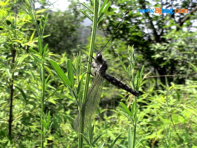 4昆虫种名:未知种类 4所属类别:脉翅目 蝶角蛉科 4拍摄时间:2002.05.17 拍摄地点:金山 4简要介绍:本种体色黯淡,多为夜间活动,有趋光性。翅膀狭长飞行能力差。 4虫体大小:体长35--40mm,翅展70mm 4区域分布: