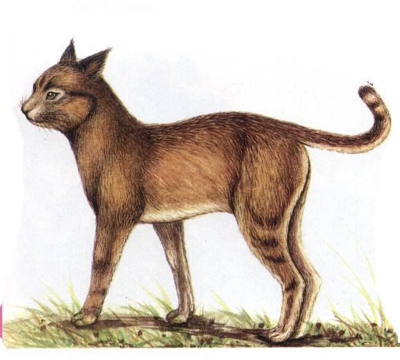 体长600-750毫米,体重800-900克。全身毛色一致,无明显环纹。与其他小型猫类相比,显得四肢较长,而尾较短(25-30毫米)。体背棕灰或沙*;眼周有黄白色纹;耳尖褐色,耳背红棕色;腹浅沙*;四肢较体背色淡;尾末段具3-4条条不明显的黑色半环,尾端棕黑色。
