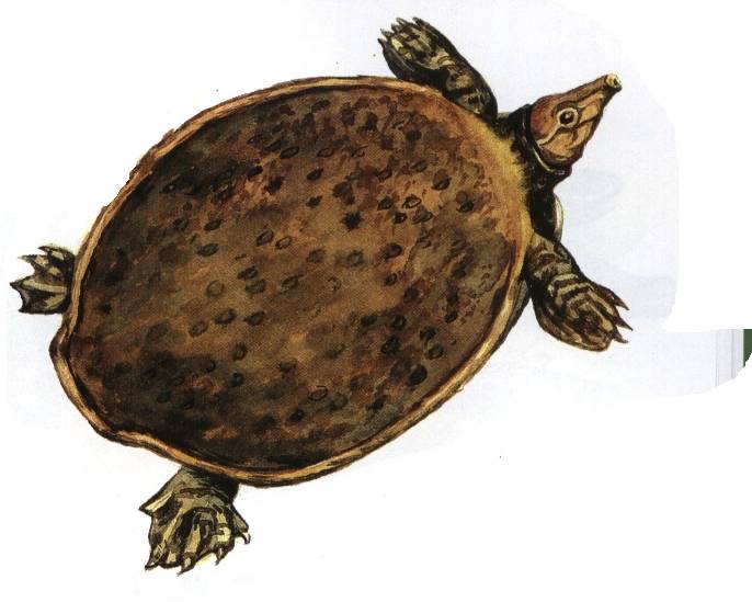 体形较大,体长可达45厘米。吻长,形成吻突。背甲椭圆形,上有散落的小疣,在甲壳的边缘有条暗线和阴暗的斑点。甲壳下有丰富血液供应煌食管绒毛和泄殖腔的结构,能在必要时进行有效的呼吸。四肢较扁,指、趾间蹼发达,具爪。头和颈可完全缩入甲内。