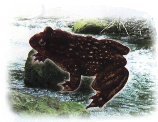 体形较大,体长53-73毫米。吻端圆且高,突出于下颌,吻棱不显。颊部向外侧倾斜,无鼓膜,犁骨齿两小团,舌大近圆形前肢粗壮,指短扁端圆;后肢短粗,左右跟部不相遇,趾蹼极发达,为满蹼。皮肤粗糙,身体背面及体侧布满瘰粒。耳后腺大而扁平。腹面皮肤较光滑。雄性胸侧各有一黑刺团。背面为灰棕色肩部有绿色花斑,咽喉至胸、腹部及四肢腹面有黑色和橘红色交织的花斑。