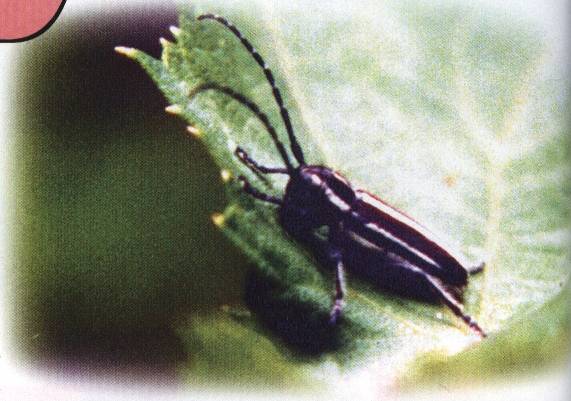 成虫体长10-15毫米,宽3-5毫米。身体黑色或浅灰至黑棕色,身上被有浓密的黑、白相杂的绒毛和竖起的毛,色深个体被毛较稀。头顶有1条灰白色直线;触角第2节起每节基部浅灰色,雄虫触角长于雌性。前胸背板中央及两侧共有3条灰白色纵条。小盾片披灰白色绒毛。鞘翅沿中缝及肩角以下各有灰白色纵条1根。