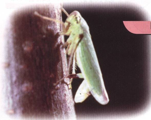 成虫体长7.5-10毫米。身体青绿色,其中头部、前 胸背板及小盾片淡黄绿色;头的前方有分为两半的褐色皱 纹区,接近后缘处有一对不规则的长形黑地。前胸背板的 后半呈深绿色。前翅绿色并有青蓝色光泽,前缘色淡,端 部透明,翅脉黄褐色,具有淡黑色窄边。后翅烟黑半透明 足橙*,前、中足的跗爪及后足腔节内侧有黑色细纹, 后足排状刺的基部为黑色。