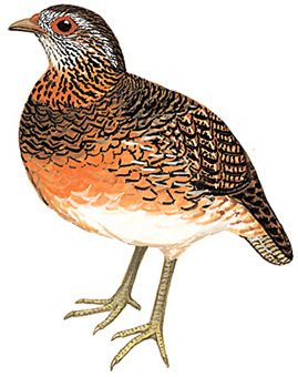 物种特征:描述:中等体型(29厘米)的橄榄褐色山鹧鸪。脚暗绿色至浅绿色,眉线及喉略白,头部无黑色。与褐胸山鹧鸪的区别在于黑色横纹较细,胸部具宽的褐色带,两胁无醒目的白色斑纹。有暗铅色眼周裸皮。 虹膜-红褐;嘴-角质黄;脚-绿色。 叫声:响亮的哨声包括一连串单音,越叫越快;然后是一连串较平的升降变调;最后是一连串狂乱升变调并突然终止。 分布范围:东南亚。 分布状况:全球性易危种(Collar et al., 1994)。中国地方性留鸟,仅分布于云南南部(西双版纳)。 习性:具本属特性。栖居于森林、次生林及竹林,高至海拔1000米。