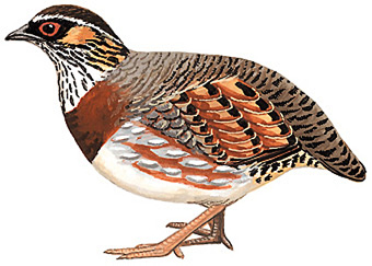 物种特征:描述:中等体型(30厘米)、色彩浓艳的山鹧鸪。头顶褐,眉纹白,胸部具宽阔的栗色环带及喉近白为本种特征。眼周裸皮红色,耳羽黄棕色。 虹膜-暗褐;嘴-灰色;脚-近粉。 叫声:繁殖雄鸟早晚间或正午鸣叫,叫声为嘹亮的上升哨音,间隔数秒反复重复。 分布范围:中国中部特有种。 分布状况:全球性极危物种(Collar et al., 1994)。栖息环境的丧失导致至野外数量极为稀少。仅存于四川南部(甘洛、屏山、马边、攀枝花市等地)海拔1000~2200米处的低山亚热带阔叶林中,亦见于云南东北部。 习性:具本属的典型特性。成对或成小群在地面烂树叶间翻找觅食。