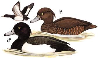 物种特征:描述:中等体型(42厘米)、矮扁结实的鸭。头带特长羽冠。雄鸟黑色,腹部及体侧白。雌鸟深褐,两胁褐而羽冠短。飞行时二级飞羽呈白色带状。尾下羽偶为白色。雌鸟有浅色脸颊斑。雏鸟似雌鸟但眼为褐色。头形较白眼潜鸭顶部平而眉突出。 虹膜-*;嘴及脚-灰色。 叫声:冬季常少声。飞行时发出沙哑、低沉的kur-r-r, kur-r-r叫声。 分布范围:繁殖于整个北古北区;南方越冬。 分布状况:繁殖在中国东北,迁徙时经中国大部地区至华南包括台湾越冬。地方性常见。 习性:常见于湖泊及深池塘,潜水找食。飞行迅速。