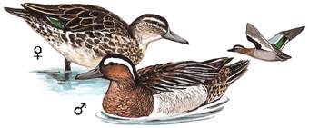 物种特征:描述:中等体型(40厘米)的戏水型鸭。雄鸟头巧克力色,具宽阔的白色眉纹。胸、背棕而腹白。肩羽形长,黑白色。翼镜为闪亮绿色带白色边缘。雌鸟褐色的头部图纹显著,腹白,翼镜暗橄榄色带白色羽缘。繁殖期过后雄鸟似雌鸟,仅飞行时羽色图案有别。飞行雄鸟蓝灰色翅上覆羽是其特征。 虹膜-榛栗色;嘴-黑色;脚-蓝灰。 叫声:通常少叫。雄鸭发出呱呱叫声似拨浪鼓。雌鸟发出轻kwak声。 分布范围:繁殖于全北界;南方越冬。 分布状况:繁殖于中国东北、西北。冬季南迁至北纬35°以南包括台湾及海南的大部分地区。并不常见。 习性:冬季常结大群。时常见于沿海泻湖。白天栖于水上,夜晚进食。