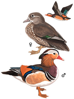 物种特征:描述:体小(40厘米)而色彩艳丽的鸭类。雄鸟有醒目的白色眉纹、金色颈、背部长羽以及拢翼后可直立的独特的棕*炫耀性"帆状饰羽"。雌鸟不甚艳丽--亮灰色体羽及雅致的白色眼圈及眼后线。雄鸟的非婚羽似雌鸟,但嘴为红色。 虹膜-褐色;嘴-雄鸟红色,雌鸟灰色;脚-近*。 叫声:常寂静无声。雄鸟飞行时发出声如hwick短哨音。雌鸟发出低咯声。 分布范围:东北亚洲、中国东部及日本。引种其他地区。 分布状况:全球性近危(Collar et al., 1994)。繁殖于中国东北但冬季迁至中国南方。记录广泛但群种数量普遍稀少。常被捉来笼养。 习性:营巢于树上洞穴或河岸,活动于多林木的溪流。