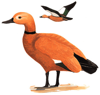 物种特征:描述:体大(63厘米)橙栗色鸭类。头皮黄。外形似雁。雄鸟夏季有狭窄的黑色领圈。飞行时白色的翅上覆羽及铜绿色翼镜明显可见。嘴和腿黑色。 虹膜-褐色;嘴-近黑色;脚-黑色。 叫声:声似aakh的啭音低鸣,有时为重复的pok-pok-pok-pok。雌鸟叫声较雄鸟更为深沉。 分布范围:东南欧及亚洲中部,越冬于印度和中国南方。 分布状况:耐寒,广泛繁殖于中国东北和西北,及至青藏高原海拔4600米, 迁至中国中部和南部越冬。 习性:筑巢于近溪流、湖泊的洞穴。多见于内地湖泊及河流。极少到沿海。