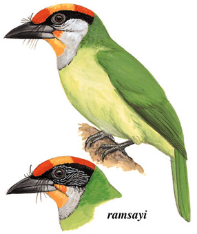 物种特征:描述:体略大(23厘米)而色彩艳丽的拟啄木鸟。颏及上喉黄而下喉浅灰为本种特征。头顶色型为红黄红色,具宽的黑色贯眼纹。 虹膜-近红;嘴-黑色;脚-黑色。 叫声:单调的 ki-ti-yook或pukwowk叫声;也作高声啼叫如peeyu, peeyu。 分布范围:尼泊尔至中国南部及东南亚。 分布状况:指名亚种偶见于西藏东南部,云南西部、南部和东南部,以及广西西南部海拔1200~-2200米山地常绿林。亚种ramsayi在云南西南部。 习性:比其他拟啄木鸟更为近山。
