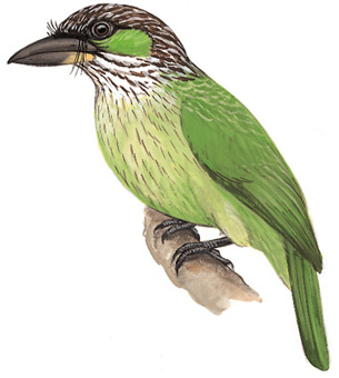 物种特征:描述:体大(24厘米)的绿色拟啄木鸟。与绿拟啄木鸟区别在于嘴更黑,头部纵纹色深,耳羽绿色,无*眼周裸皮。 虹膜-褐色;嘴-近黑;脚-黑色。 叫声:per-roo-roo-rook的喉音;也发圆润如笛音的升调pooouk叫声。 分布范围:中国东南部、泰国及印度支那。 分布状况:亚种praetermisa在中国罕见,仅记录于广州湾及广西东南部的硇洲岛。 习性:栖于开阔的落叶林林地。习性同其他拟啄木鸟。
