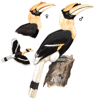 物种特征:描述:体型硕大(125厘米)的黑色及奶白色犀鸟。白色的尾上具黑色次端斑,翼黑而具白色沾黄宽横带。嘴及前凹的盔突*,脸黑色。头及胸部的白色体羽常沾*。 虹膜-雄鸟红色,雌鸟近白;嘴-*;脚-黑色。 叫声:声大而粗哑的咳叫,声如gok或wer gok。 分布范围:印度、东南亚、马来半岛及苏门答腊。 分布状况:亚种homrai为云南西部、西南部及西藏东南部低地常绿林的罕见留鸟。滥猎导致双角犀鸟从许多栖息地消失。 习性:通常成对。吵闹着飞过林顶。取食和栖息于原始林的顶冠层。