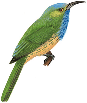 物种特征:描述:中等体型(30厘米)的绿色林栖型蜂虎,蓝色的胸羽蓬松,嘴厚重而下弯。成鸟顶冠淡蓝,腹部棕黄带绿色纵纹。尾羽腹面黄褐。亚成鸟全身绿色。 虹膜-橘*;嘴-偏黑;脚-暗绿。 叫声:低沉的咕咕喉音及平调的kirrr-r-r-r啭声。 分布范围:喜马拉雅山脉,印度北部,中国南部包括海南岛,东南亚。 分布状况:为原始林及过伐林中的不常见留鸟,分布高度至海拔1800米。指名亚种于西藏东南部、云南西部及南部;brevicaudata在海南岛。 习性:栖于高大森林上中层。无声地从高栖处捕食。停歇时尾部扇开或抽动。较其他蜂虎更属森林鸟种。