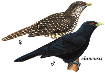 物种特征:描述:体大(42厘米)的杜鹃。全身黑色(雄鸟)或白色杂灰褐色(雌鸟),嘴绿色。 虹膜-红色;嘴-浅绿;脚-蓝灰。 叫声:日夜发出嘹亮kow?wow声,重音在第二音节,重复多达12次,音速音高渐增。也有更尖声刺耳、速度更快的kuil, kuil, kuil, kuil声。 分布范围:印度、中国、东南亚及印度尼西亚。 分布状况:亚种chinensis为中国北纬35°以南大多数地区夏季繁殖鸟;Harterti为海南岛的留鸟。 习性:昼夜不停的响亮叫声吸引着观鸟者,但几乎无人见过此鸟,因其极隐蔽,常躲在稠密的红树林、次生林、森林、园林及人工林中。借乌鸦、卷尾及黄鹂的巢产卵。