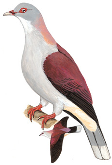 物种特征:描述:体大(46厘米)的深色鸠。头、颈、胸及腹部酒红灰色;颏及喉白;上背及翼覆羽深紫;背及腰深灰褐;尾褐黑,具宽大的浅灰色端带;尾下覆羽皮黄。 虹膜-白、灰或红色;嘴-绯红,嘴端白色;脚-绯红。 叫声:倒吸一气后接两个抑郁低浑的broom…broom声。 分布范围:印度、东南亚、婆罗洲、苏门答腊及爪哇西部。 分布状况:亚种griseicapilla为云南西南部、南部(西双版纳)以及海南岛的地方性常见鸟,于海拔400~2300米的山地森林;亚种insignis于西藏东南部。 习性:山上的群体每日飞至低地进食。