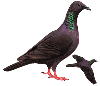 物种特征:描述:体大(43厘米)的近黑色林鸽。颈侧有绿色金属闪辉,体羽余部闪紫辉。上下体羽均炭灰色。 虹膜-深褐;嘴-深蓝;脚-红色。 叫声:拖长的oo-woo, oo-woo声及求偶时的咩咩叫声。 分布范围:日本。 分布状况:全球性近危(Collar et al., 1994)。指名亚种为山东(威海)及台湾附近岛屿的罕见夏候鸟。 习性:栖于小岛的亚热带阔叶林。结群活动。
