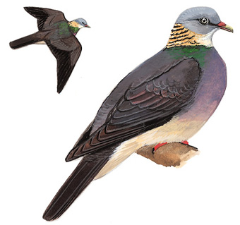 物种特征:描述:中等体型(35厘米)的灰色鸽。特征为后枕具宽阔的皮*而带黑色鳞状斑的颈环。上背呈淡紫色及绿色闪光。头部灰色较上体浅;胸灰,渐变为灰白色的臀;颏白。 虹膜-白色至*;嘴-灰绿,基部紫色;脚-红色。 叫声:深沉叫声 hu…hu…hu。 分布范围:青藏高原之喜马拉雅山脉、缅甸北部、泰国北部。 分布状况:为西藏南部及东南部、云南西部海拔1200~3200米的阔叶林中罕见留鸟。常见于台湾。 习性:单个、成对或成小群活动。性羞怯。有人上前时两翼拍打飞离。少叫。
