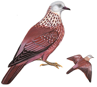 物种特征:描述:体型中等(38厘米)的褐灰色鸽。翼覆羽多具白点。与其他所有鸽种的区别在颈部羽毛形长而具端环,体羽无金属光泽。头灰,上背紫酱色,下背灰色。 虹膜-灰白;嘴-黑,嘴基紫色;脚-黄绿色,爪艳*。 叫声:非常深沉的 whock - whr -o -o…whroo声。 分布范围:喜马拉雅山脉至缅甸及中国中部。 分布状况:于西藏南部、东南部及东部,云南及四川海拔1800~3300米的常见留鸟。 习性:三三两两或成小群活动。基本为树栖性。遇警时凝神不动,以至倒悬。栖于亚高山多岩崖峭壁的森林。