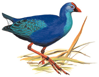 物种特征:描述:体大(42厘米)而壮,紫蓝色,红色的嘴特形大,除尾下覆羽为白色外,整个体羽蓝黑色并具紫色及绿色闪光。具一红色的额甲。 虹膜-红色;嘴-红色;脚-红色。 叫声:咕咕咯咯叫个不停;另有带鼻音的号角声wak。 分布范围:古北界至非洲、东亚地区、澳大利亚及大洋洲。 分布状况:亚种poliocephalus为云南西南部的罕见繁殖鸟,可能在西藏极东南部也有分布。云南西部、广西及香港有迷鸟越冬记录。 习性:栖于多芦苇的沼泽地及湖泊,在水上漂浮植物及芦苇地中行走。有时结小群到漫水的开阔草地、稻田或火烧过后的草地上活动。尾上下抽动。