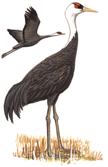 物种特征:描述:体小(97厘米)的深灰色鹤。头颈白色,顶冠前黑而中红飞行时飞羽黑色。亚成鸟头、颈沾皮*,眼斑黑色。 虹膜-黄红色;嘴-偏绿;脚-近黑。 叫声:响亮的 kurrk 叫声。 分布范围:繁殖于西伯利亚北部及中国东北;在日本南部及中国东部越冬。 分布状况:全球性有赖于保护(Collar et al., 1994)。不常见。可能在黑龙江的小兴安岭泥沼繁殖,但尚无资料证实。繁殖于兴凯湖、三江平原及内蒙古东部的呼伦池地区。 习性:栖于近湖泊及河流沼泽地。