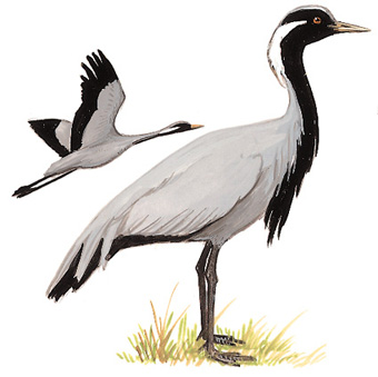 物种特征:描述:体型略小(105厘米)而优雅的蓝灰色鹤。头顶白色,白色丝状长羽的耳羽簇与偏黑色的头、颈及修长的胸羽成对比。*飞羽形长但不浓密,不足覆盖尾部。胸部的黑色羽较灰鹤的更为长垂。 虹膜-雄鸟红色,雌鸟橘黄;嘴-黄绿;脚-黑色 叫声:叫声如号角似灰鹤,但较尖而少起伏。 分布范围:北非(几乎绝种),西古北界的东南部至中亚及中国。 分布状况:繁殖于中国东北、内蒙古西部的鄂尔多斯高原及西北。越冬在西藏南部。为高原、草原、沼泽、半荒漠及寒冷荒漠的鸟种,分布至海拔5000米。 习性:飞行时呈"V"字编队,颈伸直。