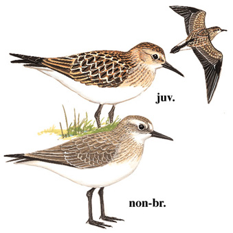 物种特征: 描述:体小(19厘米)的滨鹬。腿深灰,嘴尖细。两翼长,站立时延及尾后。体羽黄褐色,全年均有完整的带细纹胸带。幼鸟上体羽缘近白成扇贝形纹。飞行时翼上具白色横纹;尾上覆羽白色,尾灰色,中央尾羽形长而较黑。多数过境鸟仍具幼鸟羽衣。站立时翼长过尾。 虹膜-褐色;嘴-黑色;脚-深灰。 叫声:叫声独特,似低的喘息颤音preet。 分布范围:繁殖于西伯利亚东北部及北美洲的北极区。迁移至南美洲。 分布状况:在中国尚无记录,但偶见于日本,在中国应有出现。 习性:栖于海滩的近陆地段及内陆湿地。轻松进食,伴以摆尾、点头。
