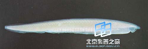 文昌鱼的外形十分古怪而有趣,它的体形很小,左右侧扁,两头尖而细,整个身体呈纺锤形,略似小鱼,一般体长只有4—5厘米,最大的也不过6.7厘米。但它与鱼类不同,头尚未分化出来,既没有明显的头部,也没有明显的脑和眼、耳、鼻等感觉器官,所以又称为无头类。在身体的前端有一个黑色小斑,称为眼点,可以感觉光线的强弱,幼体尤其畏光。前端的腹面正中有一个由薄膜构成的环形口笠,口笠周围有37—45个触须环绕,触须的数目随年龄而增加,触须上有感觉突起,感觉较为灵敏,可以保护口笠并阻止粗物进入口中。它没有成对的偶鳍,在身体后端有一个比较宽大的矛状尾鳍,背面沿中线全长有一条由皮肤折迭形成的背褶或背鳍,并与尾鳍紧相连接。尾鳍的腹侧又和它前方的臀前鳍连在一起,这些鳍都