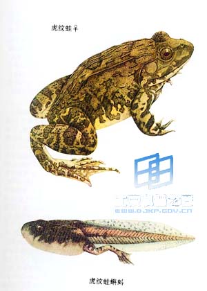 虎纹蛙是蛙类中体形较大而粗壮的一种,雌性比雄性大,体长可超过12厘米,体重250—500克。它的皮肤极为粗糙,头部及体侧有深色不规则的斑纹。背部呈黄绿色略带棕色,有十几行纵向排列的肤棱,肤棱间散布小疣粒。腹面白色,也有不规则的斑纹,咽部和胸部还有灰棕色斑。四肢为明显的横纹。由于这些斑纹看上去略似虎皮,因此得名。