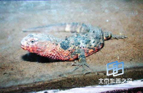 鳄蜥的全身为橄榄褐色,侧面较淡,染有桃红或桔*并杂有黑斑,背部至尾巴的端部有暗色的横纹,腹面呈乳白色,其边缘带有粉红色或桔*。头部前端较尖,后部为方形,略呈四棱锥形,顶部平坦,平铺着不显著的细鳞,近吻端的鳞片较大,颅顶部的中央有一个明显的乳白色小点,称为颅顶眼。口宽大,内有1个舌,1对内鼻孔,咽部有喉头。颌的边缘密布有同型细齿。舌为肉质,十分肥厚,先端为黑色,呈浅叉状。眼睛大小中等,瞳孔为圆形,孔的周围有金色圆圈,也有活动的上下眼脸和透明的瞬膜。在眼睛的后方,头侧的颈沟前方有明显的鼓膜。