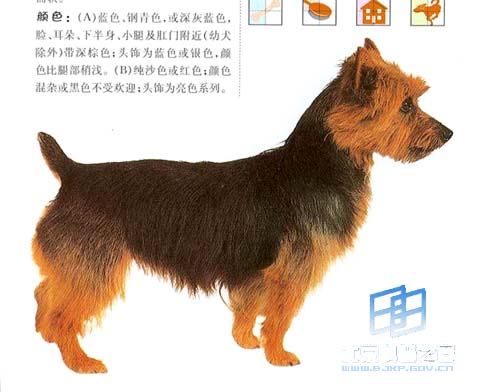 澳大利亚是在原产地被承认和展出的第一个澳大利亚品种,也是被其他国家正式接受的第一个澳大利亚品种。1887年于墨尔本成立了澳大利亚粗毛更俱乐部,1896年制定了品种标准,不久就输出到英国和美国。该犬小而结实,骨骼适中,其针毛层粗而直,除尾、掌节、后腿飞节以下以及脚部无长毛外,全身毛长6厘米,耳毛极短。绒毛层短而柔软,颈部有良好饰毛,形成保护性领毛,逐渐过渡为颈胸饰毛,前腿至掌节稍有饰毛,冠毛仅覆盖头顶,质地较其他被毛更细而柔软,毛色为蓝色带黄褐色,纯沙色和纯红色。头长而强健,颅部长而平坦,额鼻阶清晰而轻微,吻强而有力,颚有力,唇紧而深褐色或黑色边,剪式咬合,鼻黑色,自鼻沿鼻粱有一倒“V”字形无毛区。眼小、深褐色至黑
