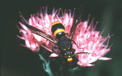 黄缘蜾蠃 Anterhynchium (D.) flavomarginatum (Smith) 英文名:eumenid poher wasp 属于膜翅目 Hymenoptera 蜾蠃科 Eumenidae。 蜾蠃的生活习性不同于其它胡蜂,其成虫平时无巢,营自由生活,仅于雌蜂产卵时,才衔泥建巢,或利用空竹管做巢,每巢产一卵,以丝悬于巢内侧,并外出捕捉鳞翅目幼虫等,经蜇剌*后贮于巢室内,以供其幼虫孵化后食用,一室常贮20-30条之多,封口后,成虫即它飞。其巢多筑于树枝、树干、石上、地上及建筑物等处。蜾蠃有寄生习性,我国浙江省曾在农田悬挂竹管,诱其产卵借以防治农田害虫。 成虫体长约18毫米。 分布:北京、浙江、江西、四川、广西、福建等地。